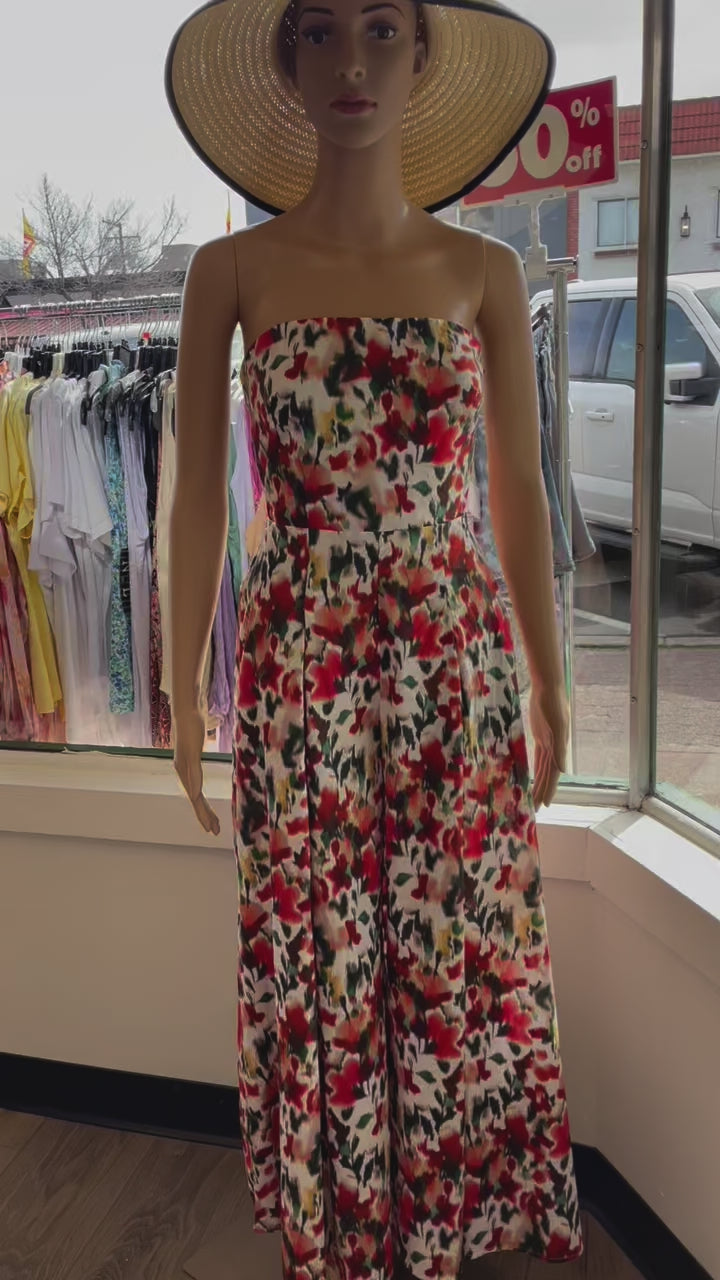 Get ready to make a statement with our Blurred Floral Palazzo Jumper! This wide legged palazzo jumpsuit features a strapless design with a tie in the back, giving the illusion of a dress. Perfect for weddings and travel, it's a versatile piece that will turn heads wherever you go.